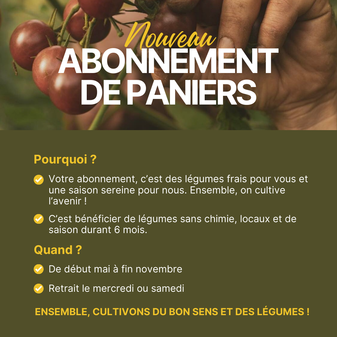 Notre magasin est ouvert le samedi de 10h à 14h et le mercredi de 13h à 17h (à partir du 31/07/24). Vous pouvez également commander un panier de légumes du mercredi au samedi avec un retrait en magasin le lundi de 17h à 19h.